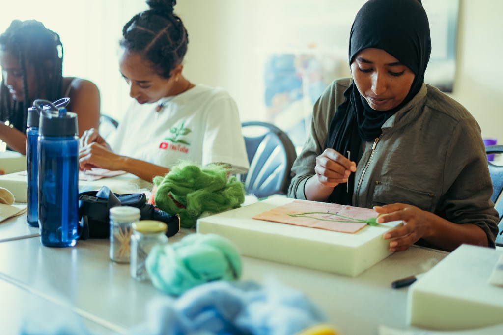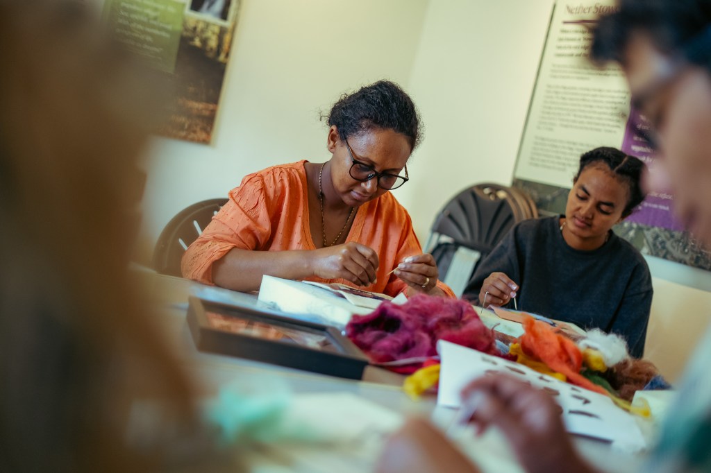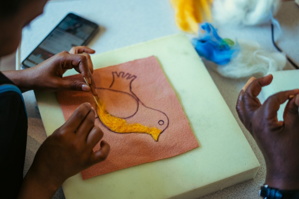We then came together to start the needle felting session, with Luan taking us through the design process, the use of tools and materials and top tips for success. We started by drawing out our individual designs onto squares of repurposed wool blanket, taking inspiration from our previous Sankofa session and continuing discussions around birds that migrate to the Quantocks from Africa.