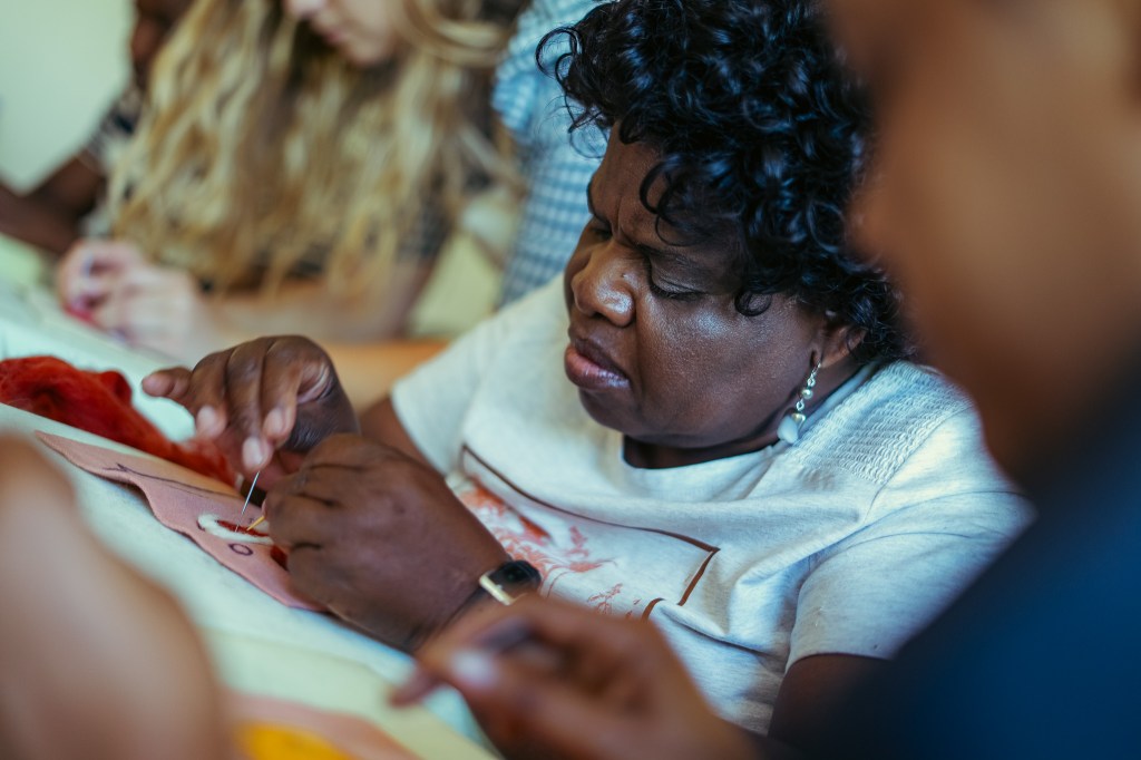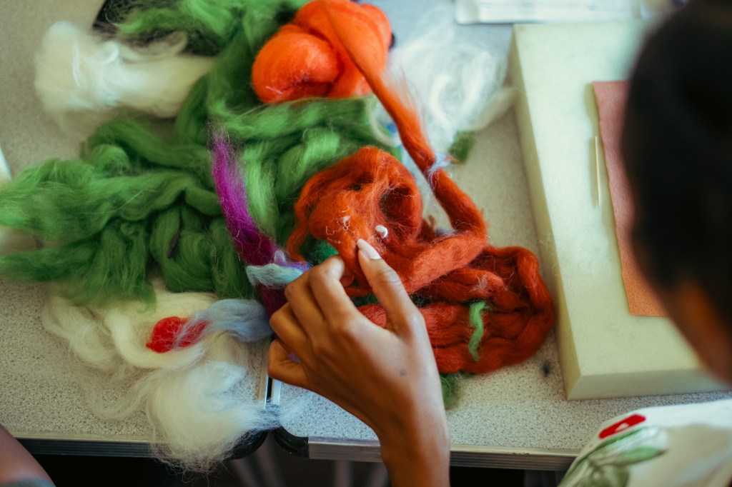 Using carded wool, a barbed needle needle and a gentle stabbing motion, the fibres of the carded wool fuse with the wool blanket. Luan also showed us how to create 3D elements, blend colours and add individuality to our designs.