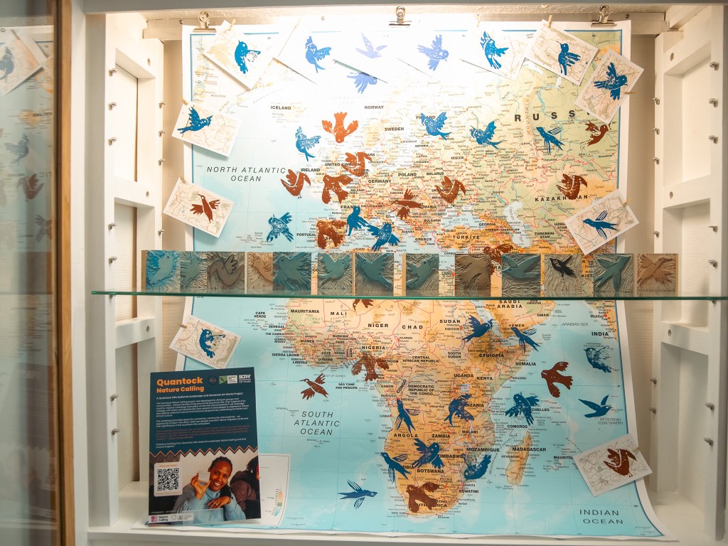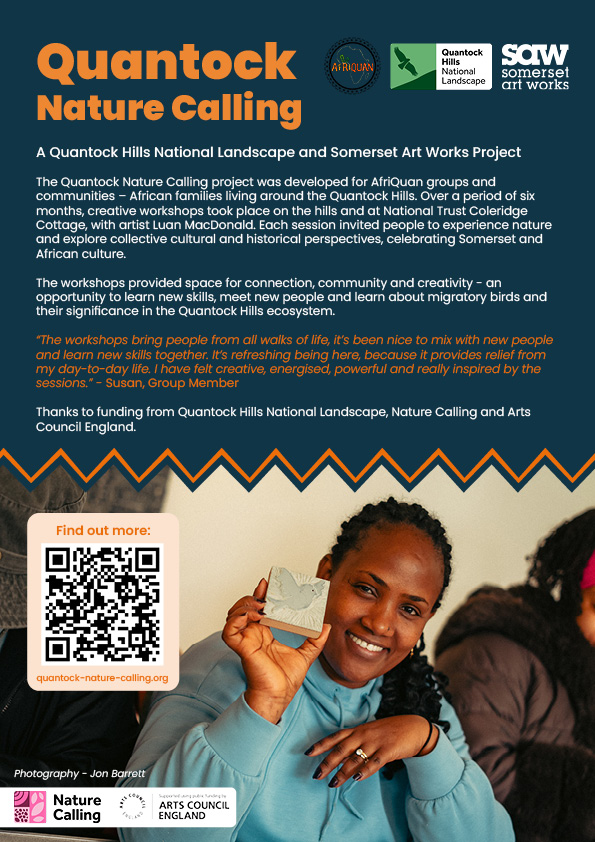 Created as part of the Quantock Nature Calling project, which took place across 6 months in 2025, we celebrate the creative achievements of participants during a series of workshops led by artist Luan MacDonald. Commissioned in partnership by Somerset Art Works and the Quantock Hills National Landscape, the participants were primarily from African communities and families living on or around the Quantock Hills, the themes explored migratory birds which travel from Africa to the Quantock Hills.